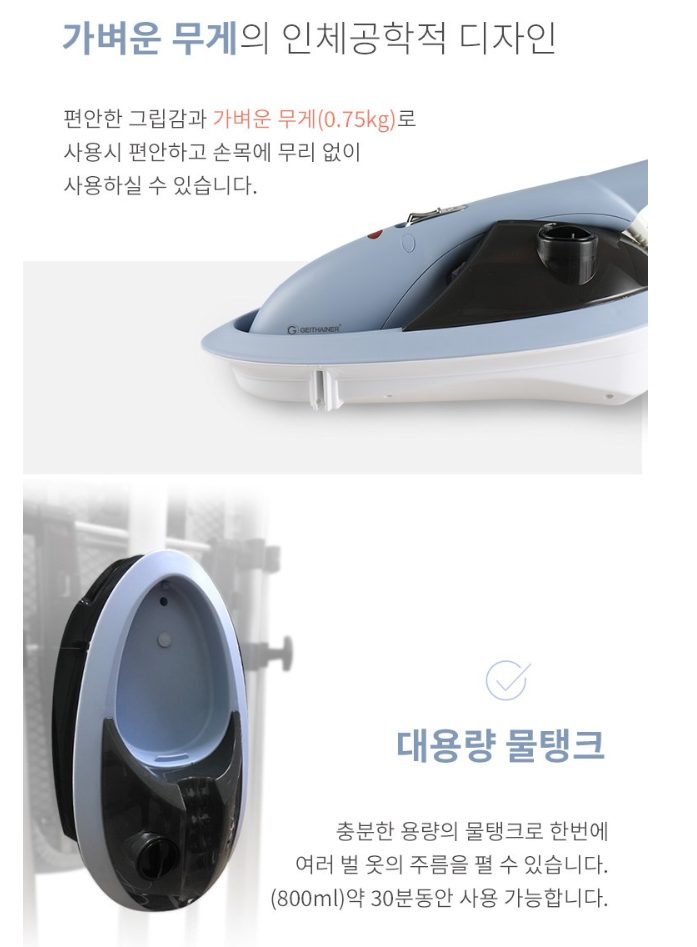 | 가이타이너 | GTLGS-3000S | 약 20만 원 | 0.8L | 수동 | 스팀+건식 겸용, 다리미판 일체형 |