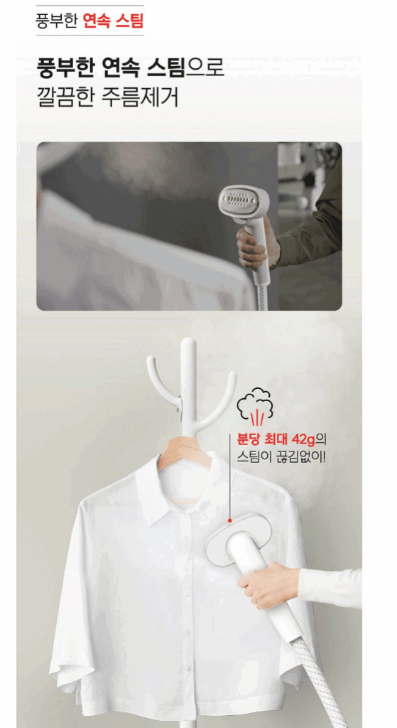 - 스팀 출력: 강할수록 주름 제거가 빠르고 시원시원!