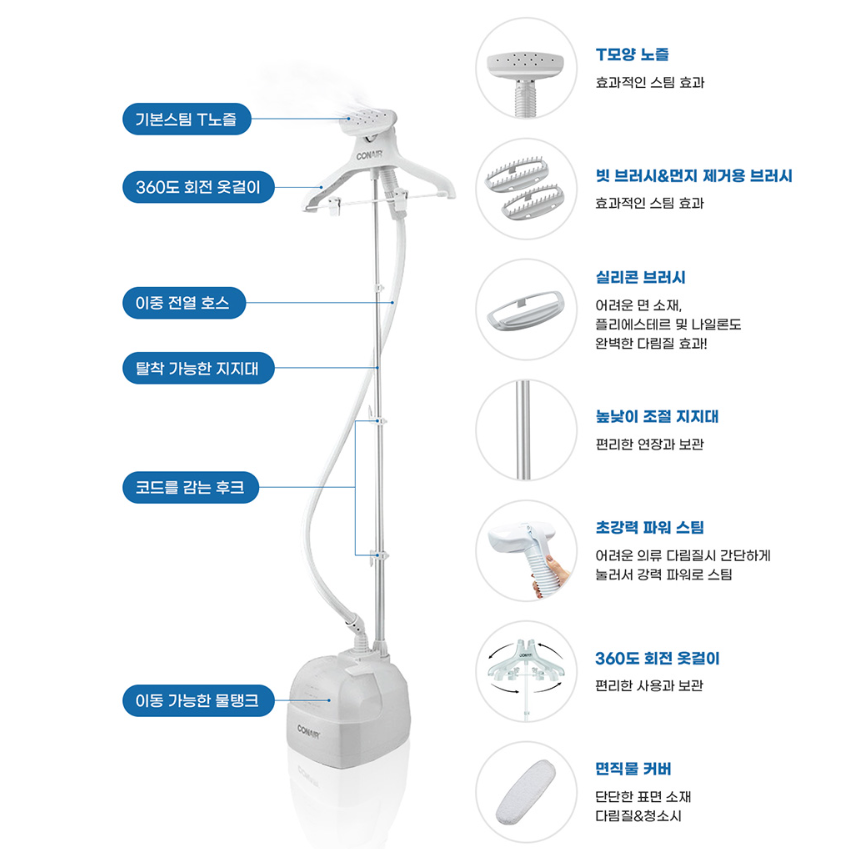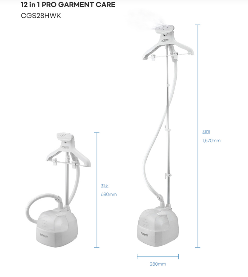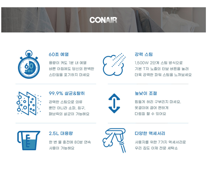 | 콘에어 | 다기능 스팀다리미 | 약 24만 원 | 2.5L | 다단계 | 최대 용량 + 7종 액세서리, 살균력 갑 |