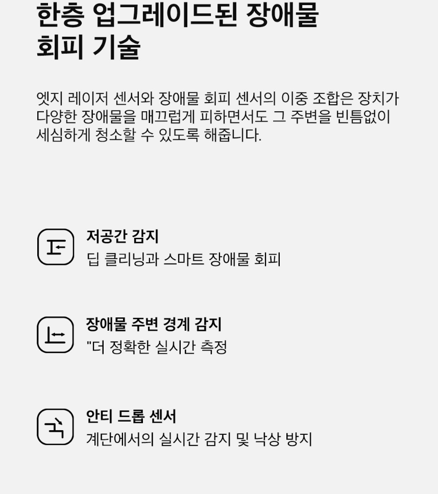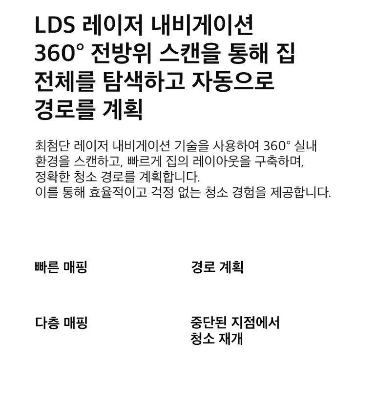 - 스마트 기능: 멀티 플로어 맵핑, 사용자별 청소 모드 지정