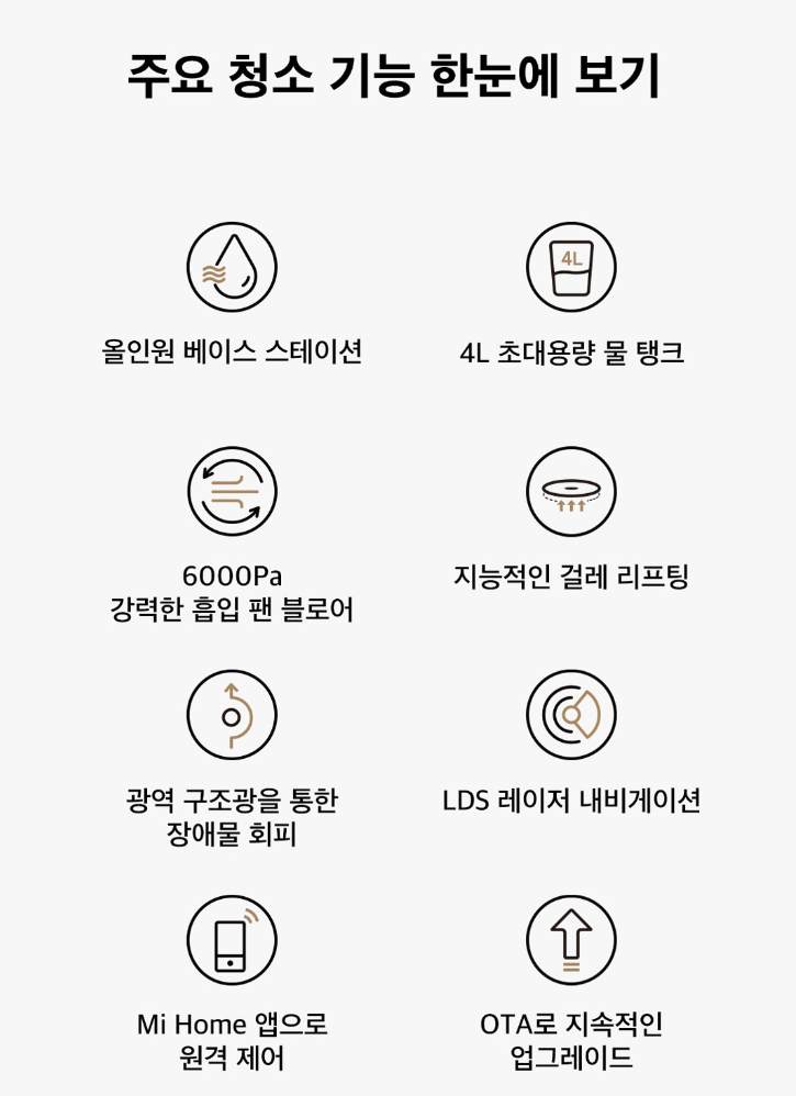 - 스마트 제어: Mi Home 앱 연동, 구역 설정 및 예약 청소