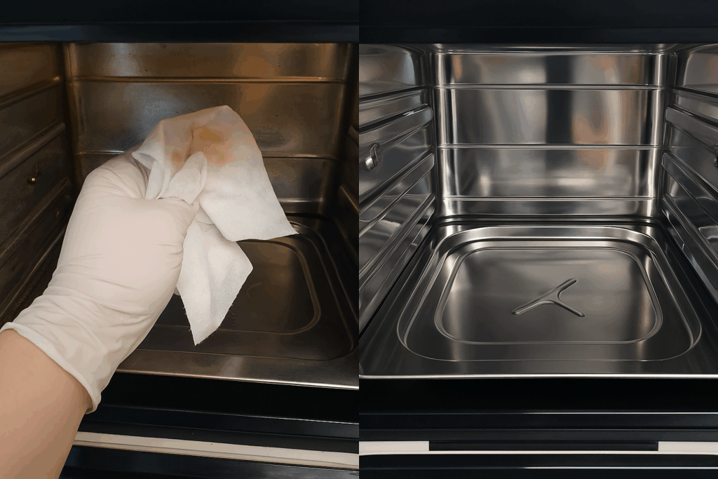 오븐형 제품은 구조상 숨은 기름때가 많습니다. 아래 부위는 특히 주의 깊게 청소해야 합니다.
