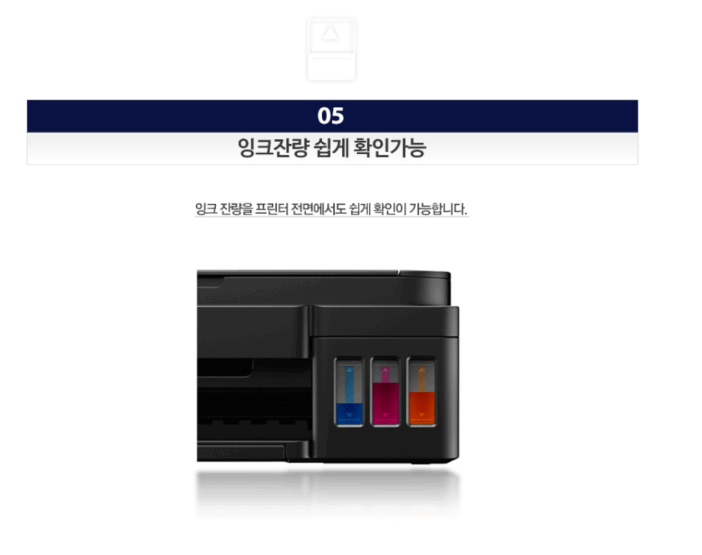 - 편의성을 높인 디자인: 잉크탱크가 본체 안에 빌트인 디자인으로 설계되어 있는 덕분에, 외부에 별도 튀어나온 공급기 없이도 깔끔한 모습입니다. 프린터 전면에는 투명한 잉크창이 있어서 남은 잉크량을 직관적으로 확인할 수 있어 관리가 수월합니다. 크기는 가로 445mm × 세로 330mm로 책상 위에 무리 없이 올려둘 수 있는 수준이며, 전면에 간이 LCD 표시창 및 최소한의 버튼들이 배치되어 전원 온오프나 무선 연결, 흑백/컬러 복사 등의 기본 조작을 할 수 있습니다. 또한 일정 시간 미사용 시 자동으로 전원이 꺼지는 자동 전원 차단 기능도 지원되어 불필요한 전력 소모를 막아줍니다.