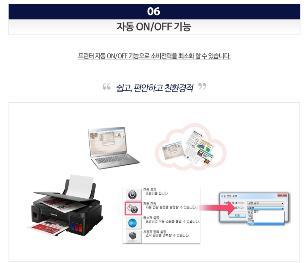- 용이한 유지보수: 잉크 충전이 간편하고 깨끗하며, 프린트헤드도 사용자 스스로 교체할 수 있게 설계되어 있습니다. 잉크가 모자라면 전용 리필 병을 잉크탱크 주입구에 꽂기만 하면 자동으로 필요한 만큼 채워지고 넘치지 않아 초보자도 쉽게 다룰 수 있습니다. 또 헤드가 소모되거나 막혔을 때 수리점에 맡기지 않고도 사용자가 직접 새 헤드로 교체할 수 있어(별도 구매) 지속적인 관리 비용을 줄일 수 있습니다. 경쟁사의 일부 모델이 헤드 일체형으로 설계되어 고장 시 프린터를 통째로 맡겨야 하는 것과 비교되는 부분입니다. 그 밖에도 자동 전원 차단 기능으로 전력 절약이 되고, 프린터 드라이버의 헤드 클리닝 유틸리티로 주기적인 노즐 관리도 쉽게 할 수 있어 전반적인 유지보수가 편리합니다.